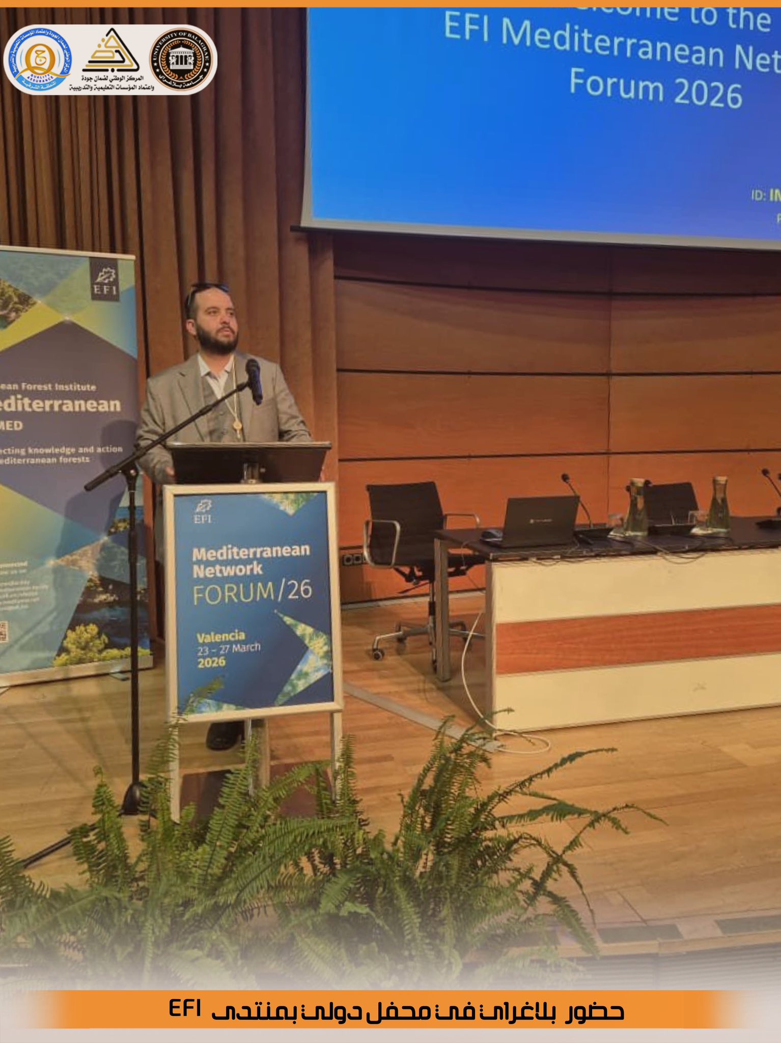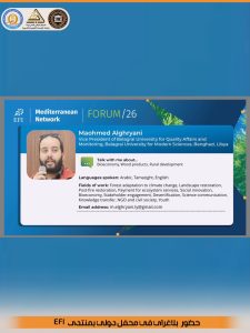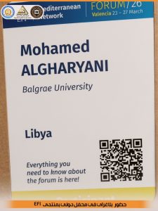 ضمن فعاليات منتدى شبكة البحر المتوسط التابع لـ European Forest Institute (EFI) لعام 2026، والمقام في مدينة فالنسيا الإسبانية، يشارك الأستاذ المهندس محمد الغرياني ممثلًا عن جامعة بلاغراي، ضمن المشاركين في هذا الحدث الدولي.